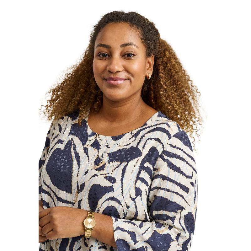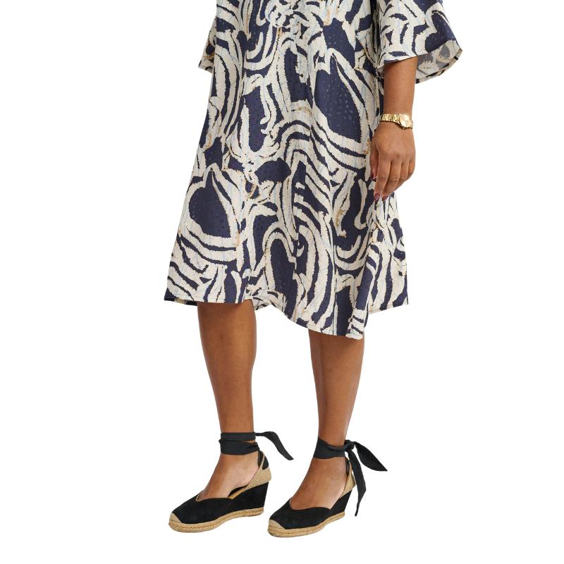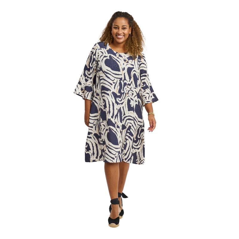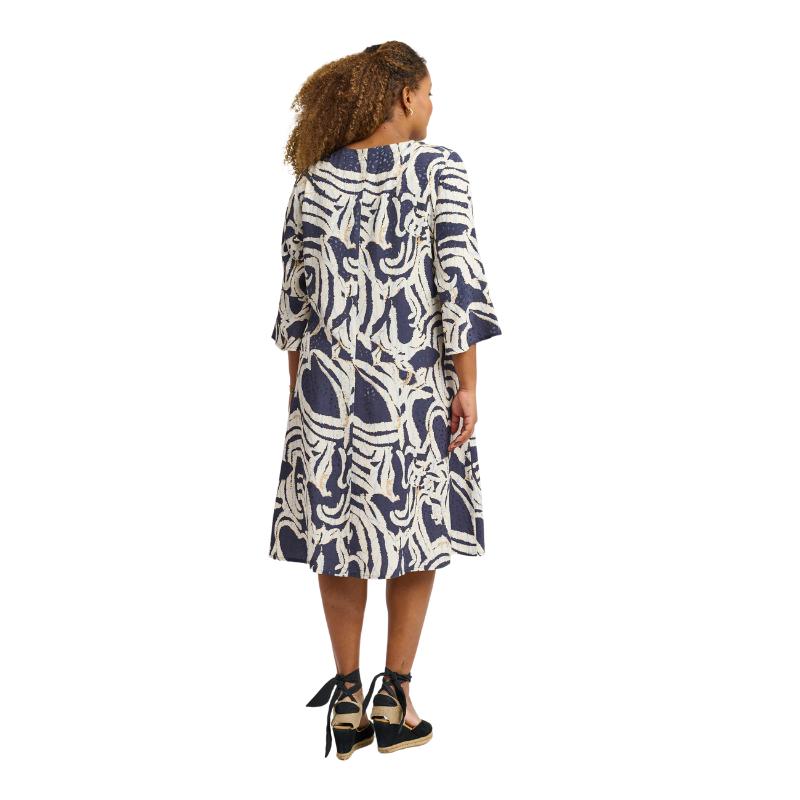 Uniikki graafinen kuvio yhdistettynä kevyesti laskeutuvaan viskoosiin tekee mekosta ilmavan ja mukavan koko päivän ajaksi. 3/4 hhihat ja pyöreä pääntie luovat tyylikkään ja ajattoman siluetin, joka sopii kaikkiin tilaisuuksiin.