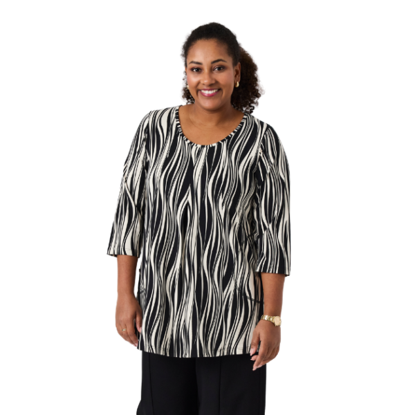 Tämä Pont Neuf -tunika on täydellinen yhdistelmä näyttävyyttä ja mukavuutta. Mustavalkoinen, aaltoileva kuosi tuo asuun eloa, mutta säilyttää silti ajattoman ja helposti yhdisteltävän ilmeen.