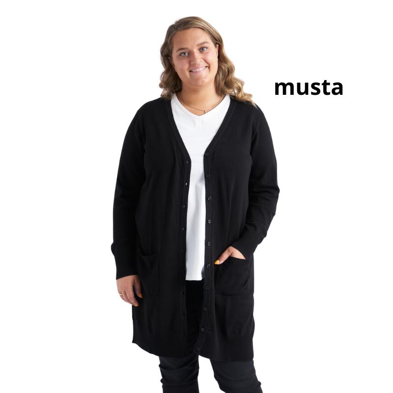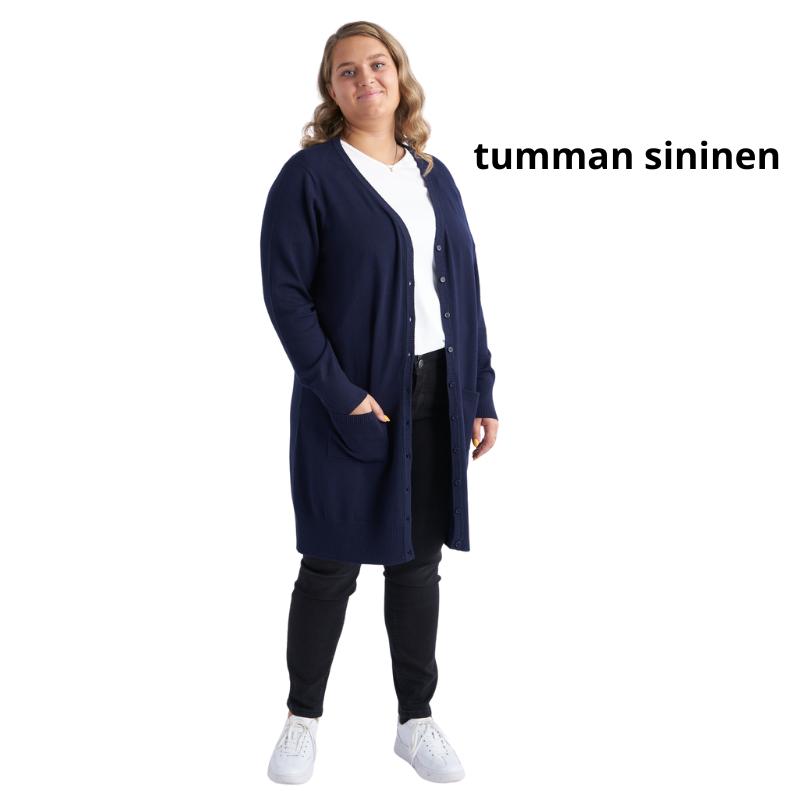 Syverine on pitkä, kauniin yksivärinen neuletakki, joka ihastuttaa ajattomalla tyylillään ja miellyttävällä istuvuudellaan. Siinä on V-pääntie, pitkät hihat, napitus edessä koko matkalta sekä käytännölliset sivutaskut.